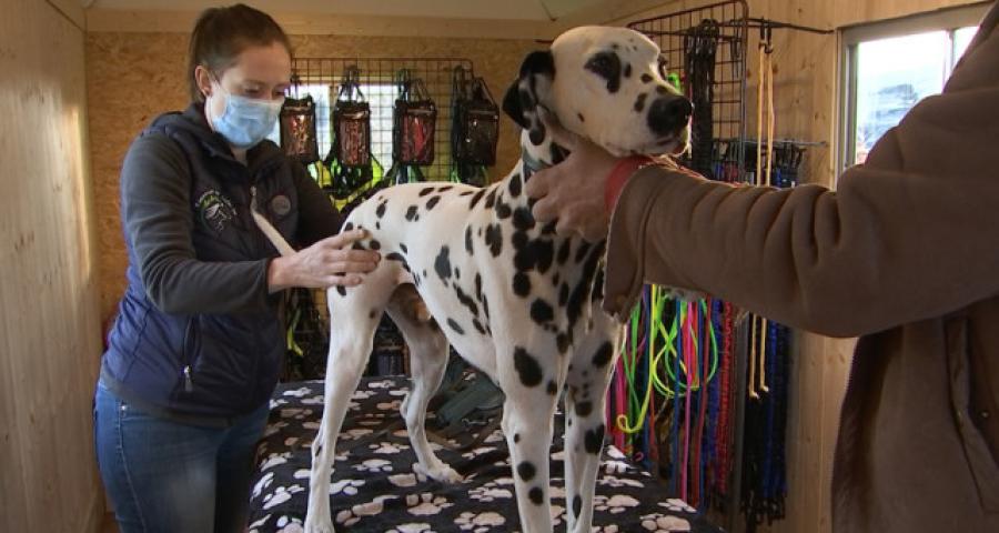 Service ostéopathique canin dans une roulotte aménagée pour la vente d'accessoires canins