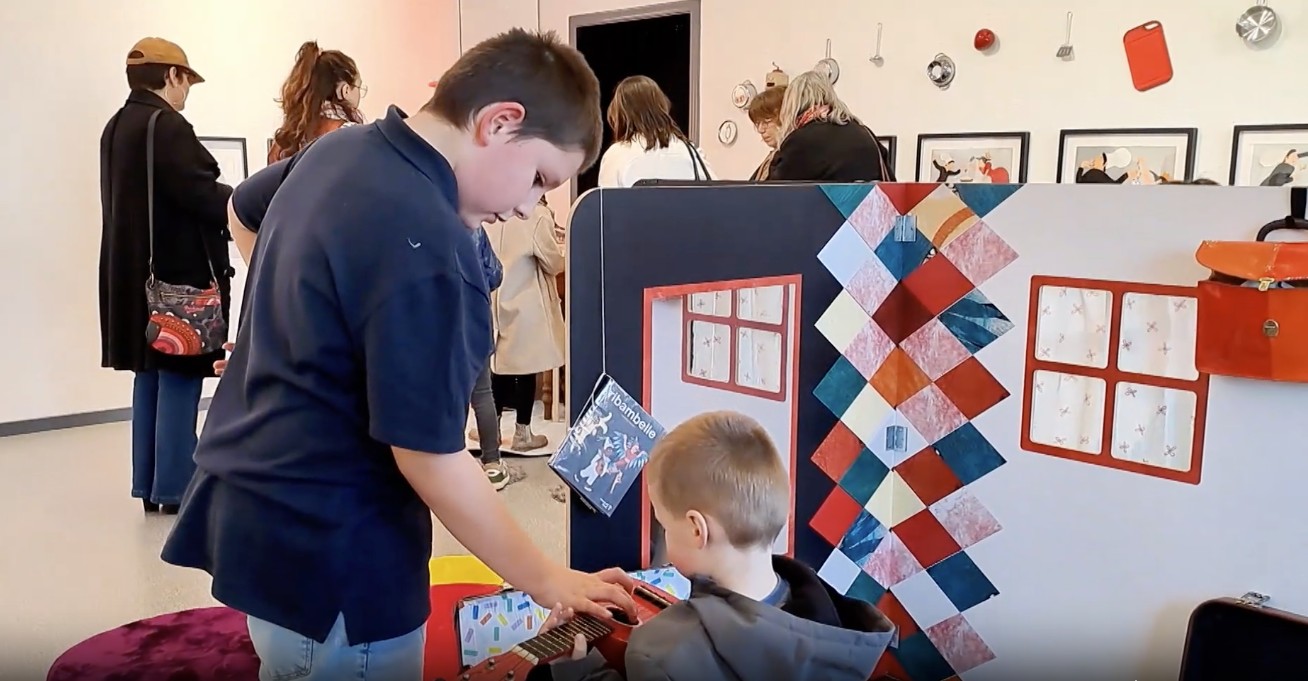Comme un livre ouvert à taille d'enfant ou un petit décor de théâtre, « Jour de fête » invite au jeu et à la mise en scène. On se déguise, on cuisine, on joue de la musique... On découvre le livre avec tous nos sens. "C'est vraiment une exposition à jouer et pas uniquement à regarder..." précise François Wautelet, chargé de communication et invité de notre JT dans la vidéo annexée