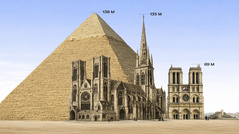 L’édifice impressionne par ses dimensions. Sa tour principale atteint près de 135 mètres de hauteur, soit pratiquement l’équivalent de la grande pyramide de Khéops en Égypte.