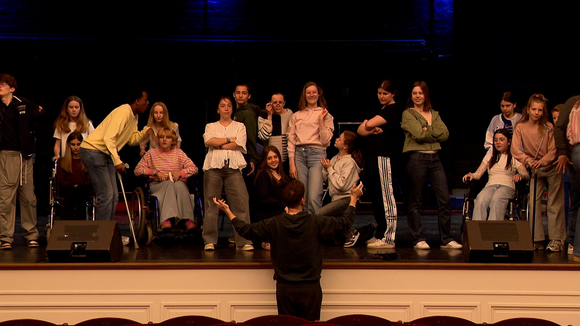 "Les jeunes doivent, même s'ils ne savent pas, s'ils ne sont pas forcément danseurs, ils doivent quand même être à l'aise dans leur corps et pouvoir se déplacer sur scène, faire des petites chorégraphies. Il y en a qui sont danseurs plus que d'autres et là, il y a des chorégraphies plus élaborées et plus abouties. Mais chacun fait les trois disciplines", explique Valérie Califice, directrice opérationnelle asbl Enchanté.