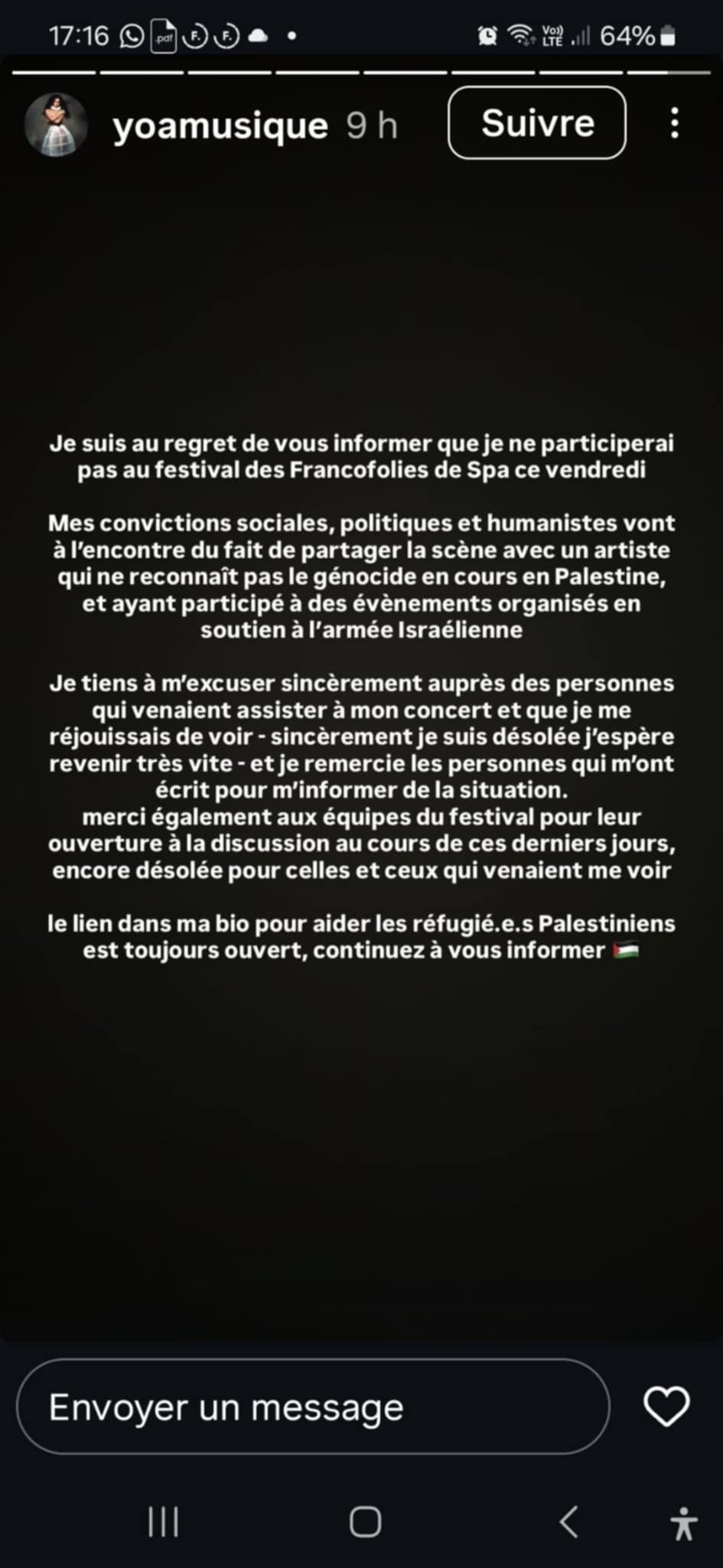 « Mes convictions sociales, politiques et humanistes vont à l'encontre du fait de partager la scène avec un artiste qui ne reconnaît pas le génocide en cours en Palestine, et ayant participé à des évènements organisés en soutien à l'armée Israélienne », a-t-elle écrit sur son compte Instagram.