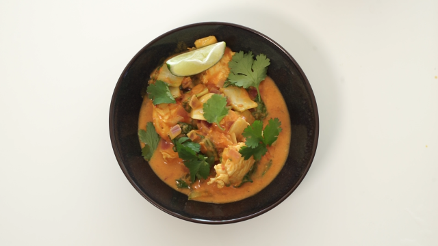 - 500gr de poulet - 1 boite de pulpe ou cubes de tomate (400gr)- 1 petite boite de crème de coco- 1 càs d’huile de coco ou d’olive ou ghee- 500gr de légumes verts au choix et suivant les saisons : haricots frais ou surgelés, épinards, pakshoy, chou kale/frisé,…- 1-2 oignon(s)- 3 gousses d’ail- 1/2 mangue en dés ou 1/2 boite de pulpe de mangue - 2 càc de curry- 1 càc de curcuma- 1 càc de gingembre moulu ou pâte de gingembre- 1 cube de bouillon dégraissé (poulet ou légumes)- 1 belle pincée de chili ou quelques gouttes de Tabasco- Coriandre ou persil frais- Lime pour décorer