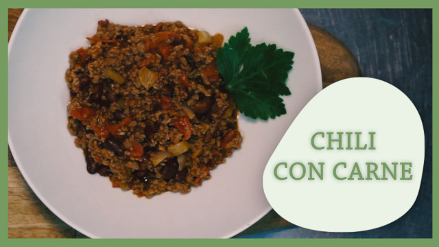 - 1 gousse d’ail- 2 gros oignons- 1 petite branche de céleri- 2 cuillerées à soupe d’huile d’olive- 400g de viande de bœuf hachée grossièrement- 1 grosse cuillerée à soupe de cumin en poudre- 1 cuillerée à café d’origan séché- 1 boite de tomates pelées de 425ml- 3 boites de 400g de haricots rouges cuits- Sel et poivre