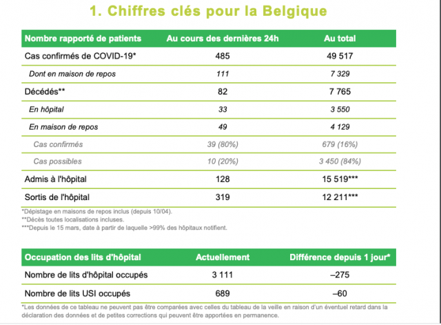 Les chiffres Covid19 du jour confirment le ralentissement de la propagation: 128 admissions à l'hôpital pour 319 sorties. Une diminution de 60 lits en Soins Intensifs.