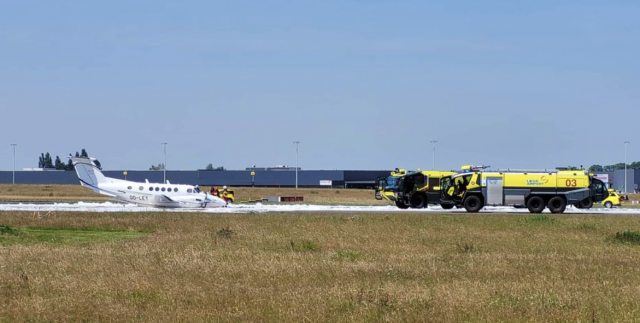 Il s'agit d'un Beechcraft King Air, qui réalisait un entraînement et des "posés-décollés,". Il a atterri sans son train d'atterrissage aux alentours de 13h15 .
