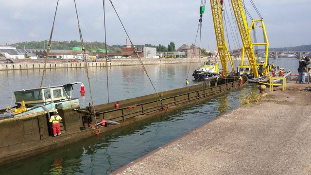 RTC Télé Liège vous l'annonçait la semaine dernière, la péniche échouée au pont d'Ougrée n'a pas été découpée comme initialement prévu mais bien extraite de sa position inconfortable en une pièce.