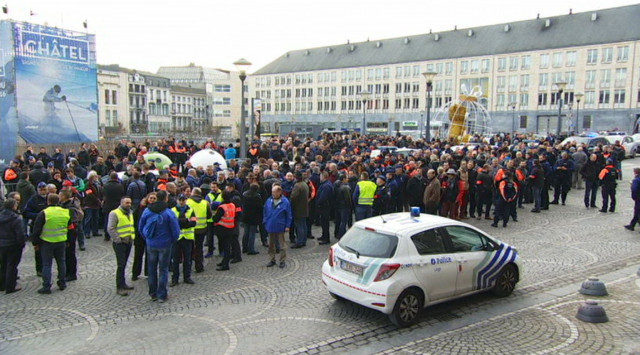 Manifestation en front commun des policiers liégeois place St Lambert à Liège. Ils protestent notamment contre une note du procureur du Roi de Liège relative à l'usage de la contrainte par des fonctionnaires de police.