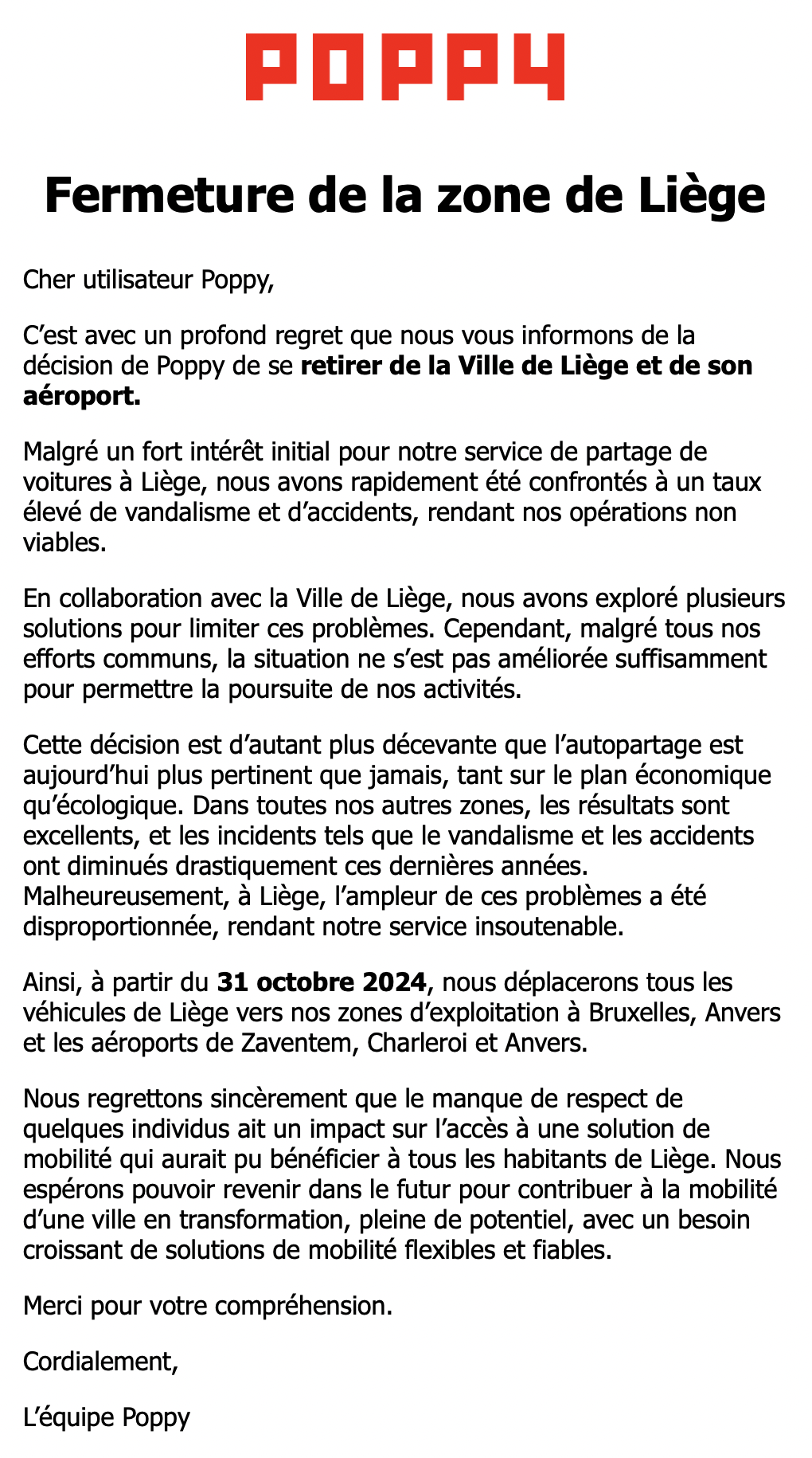 "Nous regrettons sincèrement que le manque de respect de quelques individus ait un impact sur l’accès à une solution de mobilité qui aurait pu bénéficier à tous les habitants de Liège", assure l'entreprise avant de clôturer avec ces quelques mots : "Nous espérons pouvoir revenir dans le futur pour contribuer à la mobilité d’une ville en transformation, pleine de potentiel, avec un besoin croissant de solutions de mobilité flexibles et fiables."