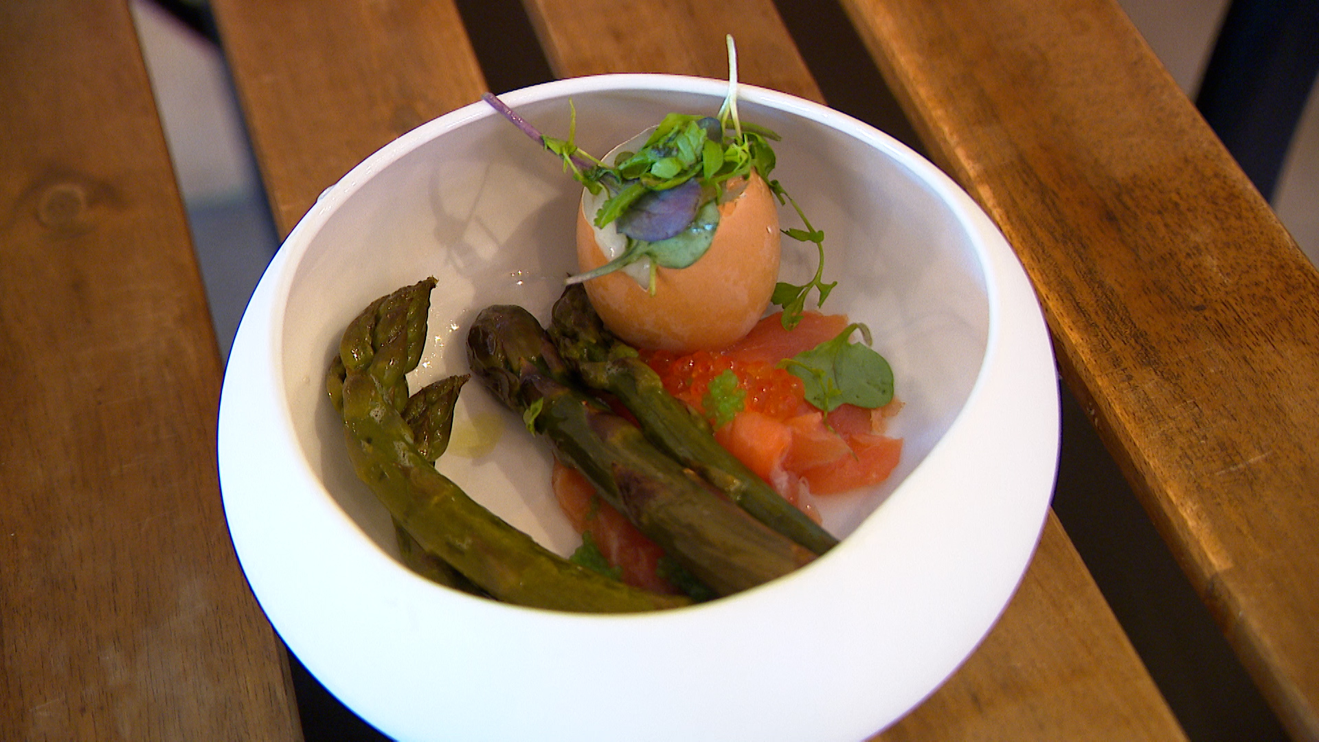 "Nous, on aime bien la mettre dans l'assiette, parce que les clients sont demandeurs de ça. C'est saisonnier. Ça sent finalement le printemps qui arrive. Nous, on le met vraiment en avant en ne la travaillant pas de trop, on la cuit simplement en sous vide. Petit passage à la poêle du saumon fumé maison et un œuf qui accompagne parfaitement ce repas", explique David Gillon.