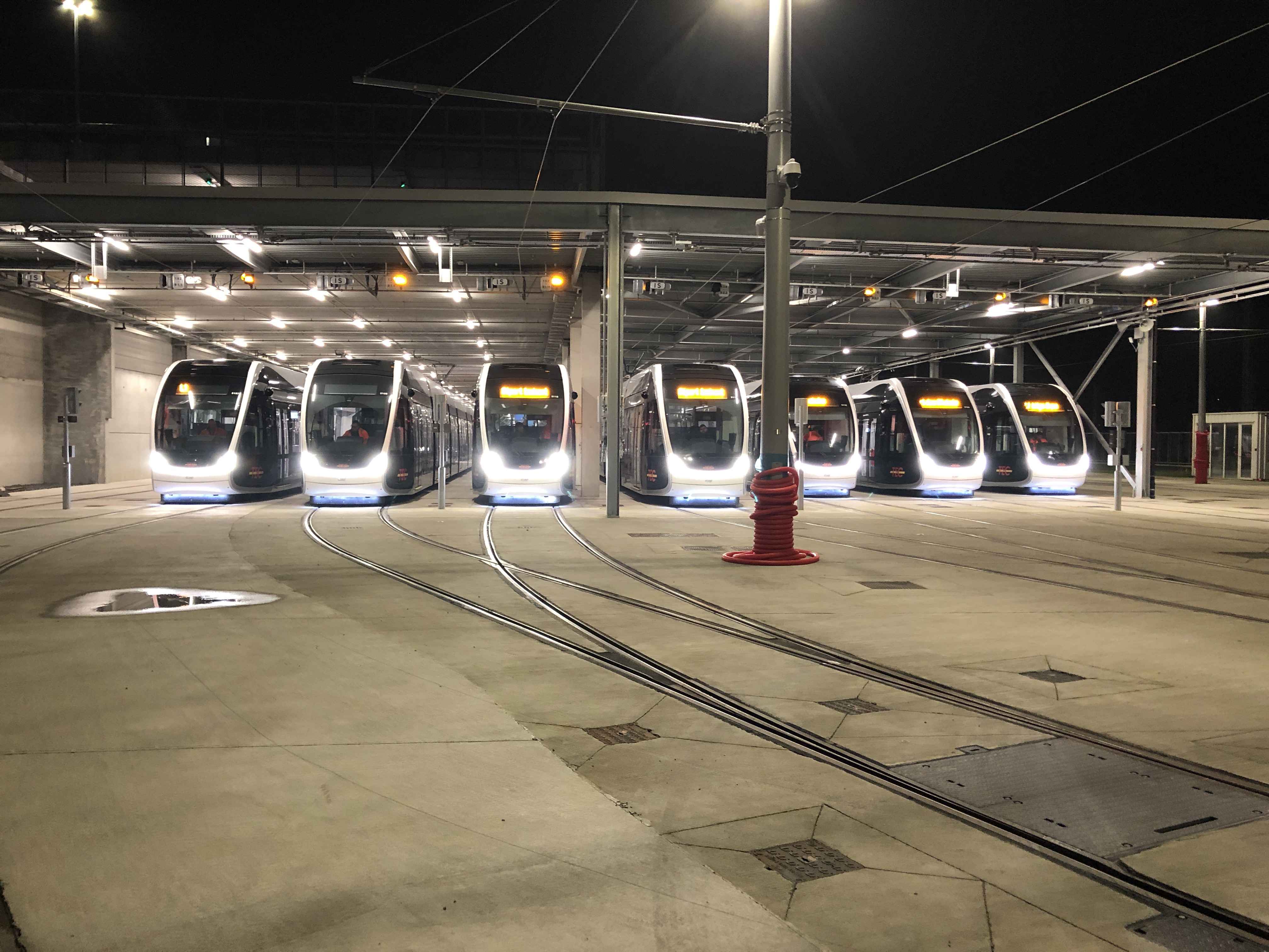 Dans le dossier du tram, une étape symbolique et historique a été franchie ce lundi matin avec, pour la toute première fois dans le dossier, la sortie de 18 rames simultanément. Jusque-là, le maximum était de 10 rames sur la ligne en même temps. Il s’agissait ce matin d’un test grandeur nature en terme de capacité de la ligne, 18 rames correspondant à ce qui sera utilisé en début de journée en service commercial.