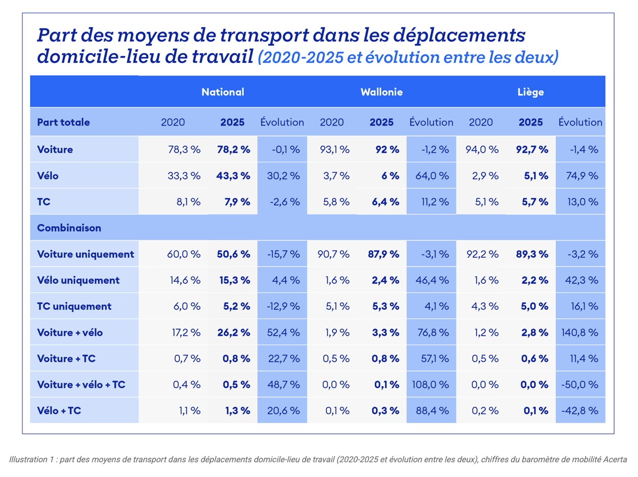 Un travailleur sur 20 en province de Liège se sert du vélo pour se rendre au travail, cela représente une hausse de pas moins de 75 % en cinq ans ! Mais la voiture reste et de loin le véhicule le plus utilisé pour les trajets domicile/travail