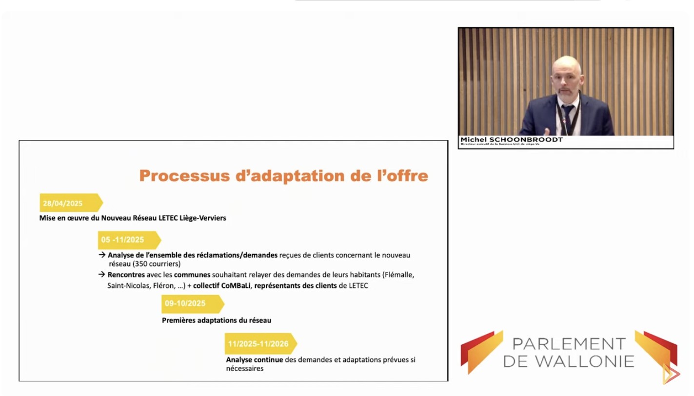 Dans la foulée, la commission a entendu le directeur de la Business Unit Liège-Verviers, Michel Schonbroodt qui a rappelé les tenants et aboutissants qui ont conduit au nouveau réseau et à la nouvelle offre de transport