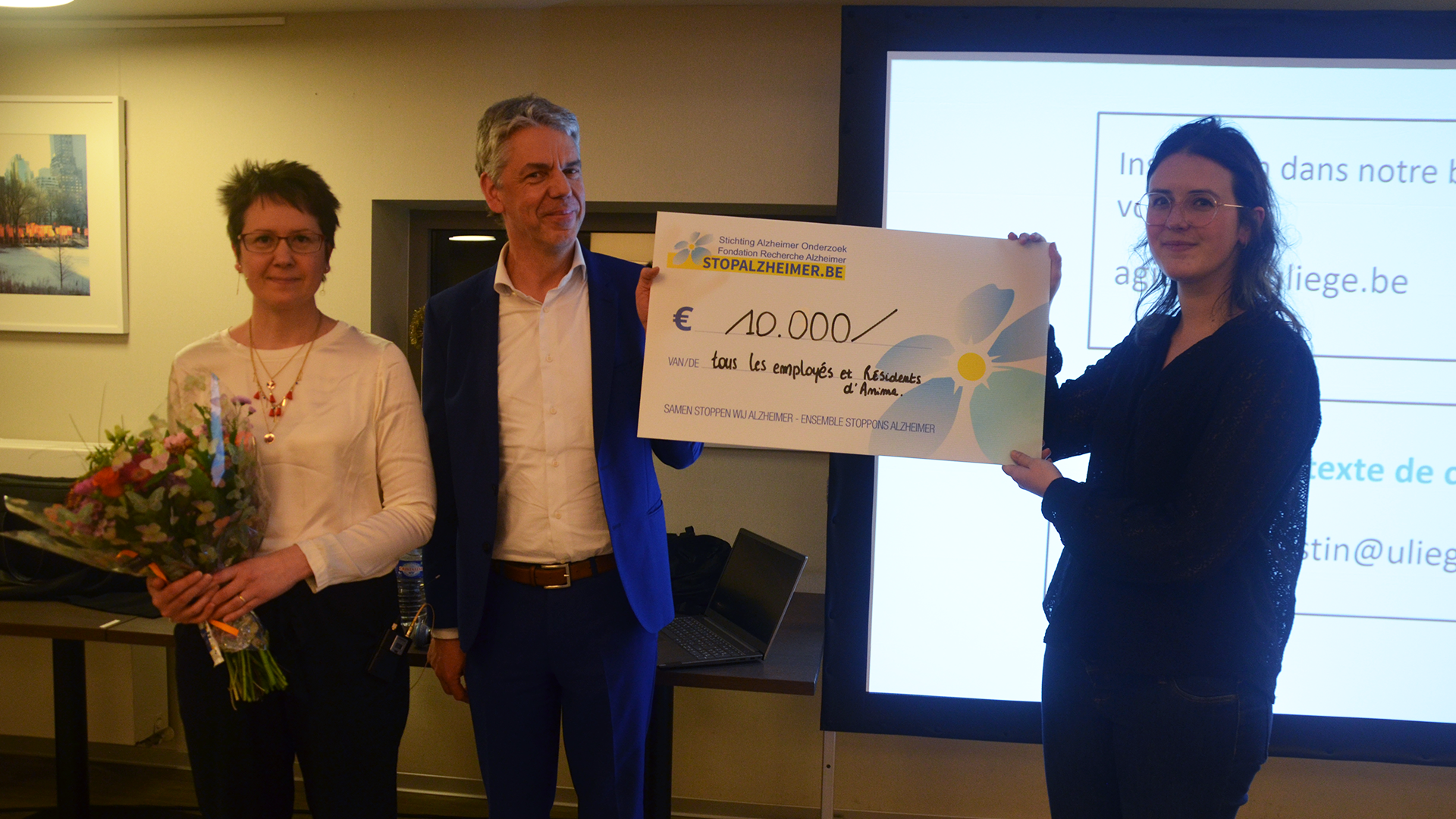 Ce jeudi 20 février 2025, au centre de soins résidentiels Les Comtes de Méan à Blegny , Wim Haentjes, COO d'Anima, a remis un chèque de 10.000 euros au nom de tous les résidents à Stop Alzheimer – Fondation recherche Alzheimer