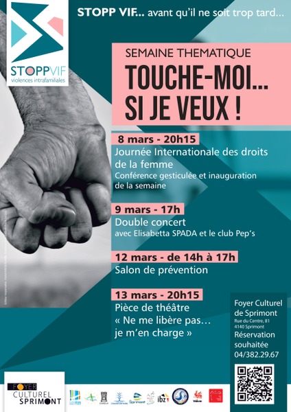 Ce samedi 8 mars, c'est la journée internationale des droits des femmes. Dans ce cadre, le réseau STOPP VIF, créé par les 5 communes de la zone de police SECOVA, organise une semaine thématique "Touche moi... Si je veux" au foyer culturel de Sprimont.