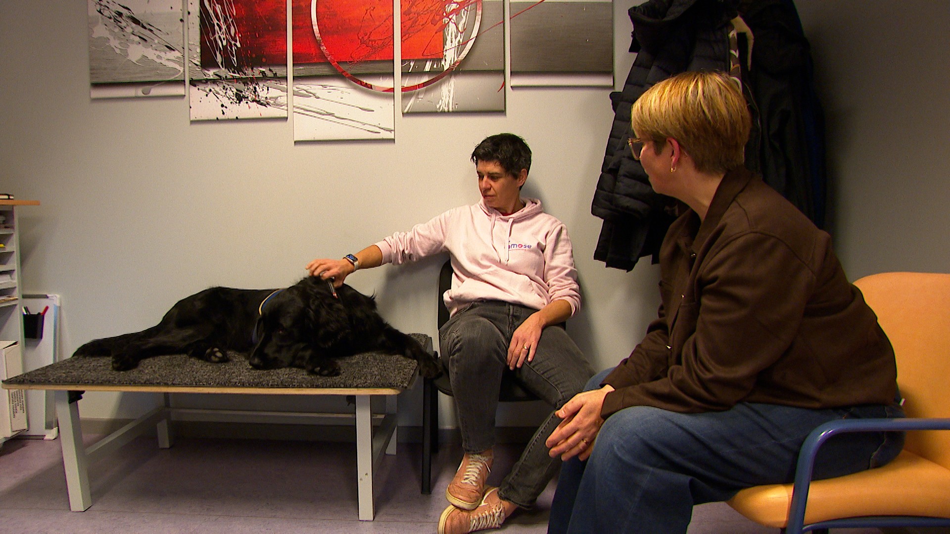 "On va apprendre au chien à monter sur la table, à rester au contact. On va apprendre à la policière à veiller sur son chien, à respecter son bien être parce qu'on parle de bien-être de victime. Mais il y a aussi le bien-être des chiens qui est primordial. Donc Stéphanie a vraiment suivi une formation pour détecter tous les signes de stress éventuels ou de mal-être du chien pour pouvoir stopper à un moment donné et mettre le chien en pause", explique Vanessa Wey, directrice de l'asbl Os'mose.