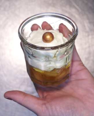 Ingrédients- 250 gr de mascarpone - 1/2L crème fraîche - 200gr de beurre - 1/2c à c de vanille en poudre ou arôme de vanille - 2 pommes Jonagold- 200gr de sucre fin Recette1. Détailler les pommes en dés2. Les caraméliser dans une poêle anti adhésive avec beurre et sucre 3. Les mettre dans un plat à gratin et refroidir 4. Dans un saladier battre le mascarpone avec 50 gr de sucre fin la crème fraîche la vanille. Elle doit s'épaissir. 5. Attention pas comme une chantilly. Elle doit être onctueuse.7. Mettre les pommes dans les verrines 8. Napper avec la crème mascarpone Vous pouvez décorer avec un fruit, comme du physallis.Cette recette vous est proposée en collaboration avec le Restaurant Le Saint Lambert.