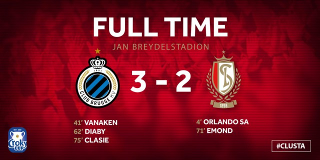 A l'heure de jeu, le FC Bruges prend l'avantage par Limbombe sur une assist du soulier d'or Ruud Vormer. A ce moment-là, à une demi-heure de la fin de la partie, l'équipe locale n'est plus qu'à deux buts d'arracher les prolongations. Les supporters liégeois s'attendent à un fin de partie de folie de la part de leurs adversaires, mais il n'en est rien, d'autant plus que les Liégeois, bien organisés et efficaces en contre trouvent une nouvelle fois le chemin des filets par Emond à la 71 ème.