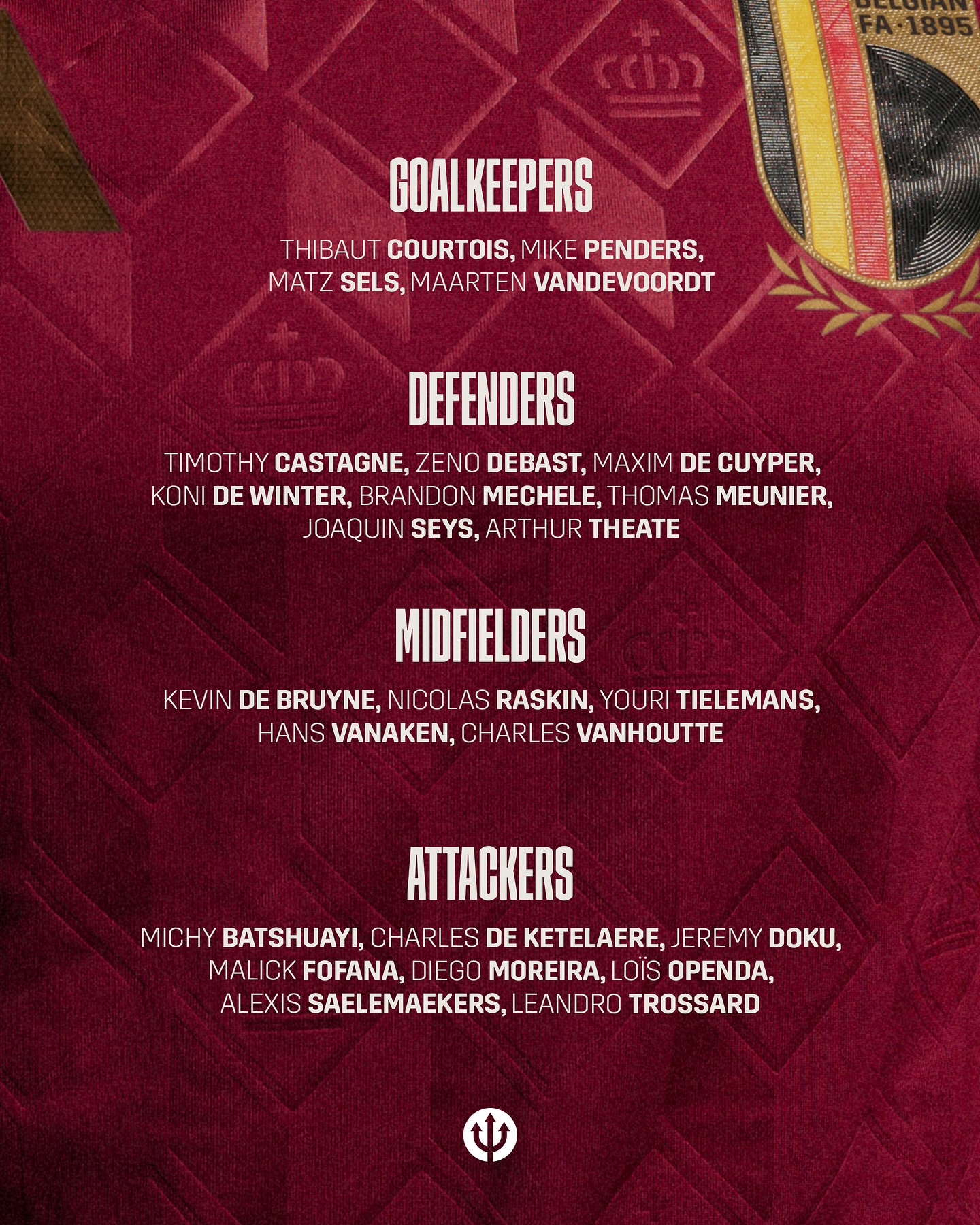Avec un groupe de 25 joueurs, la Belgique affrontera d'abord le Liechtenstein à Vaduz le jeudi 4 septembre avant de recevoir le Kazakhstan à Anderlecht le dimanche 7 septembre. Il s’agit de deux rencontres de qualification pour le Mondial 2026.